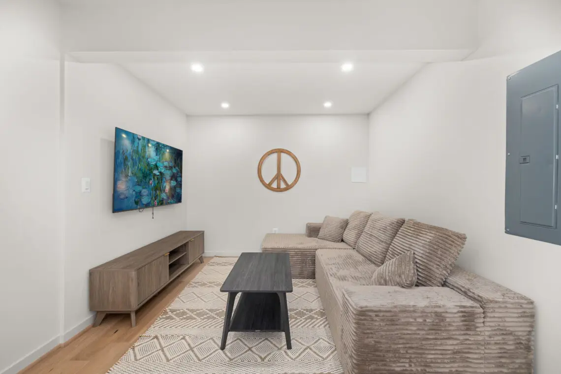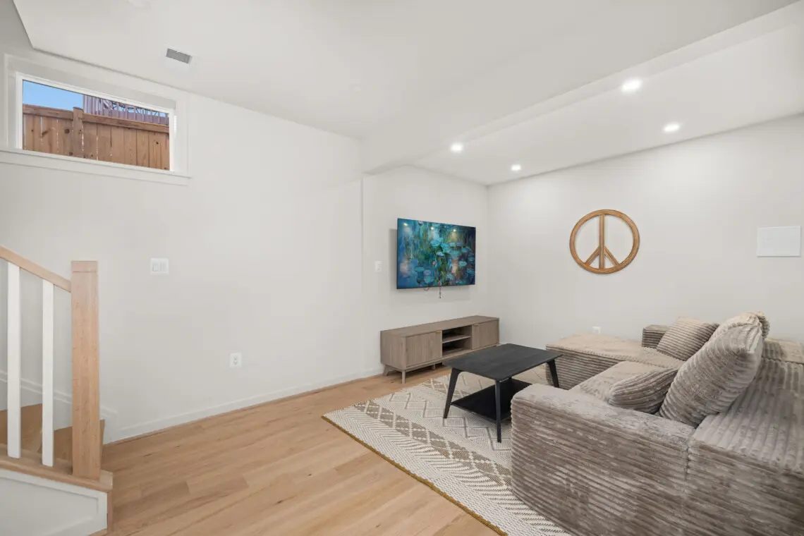 – Rec Room: Oversized sectional sofa, Smart TV, and separate hangout space