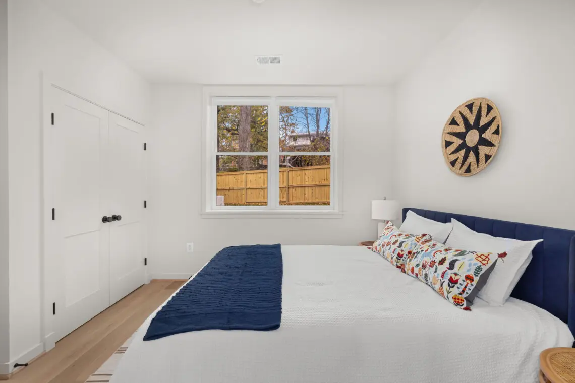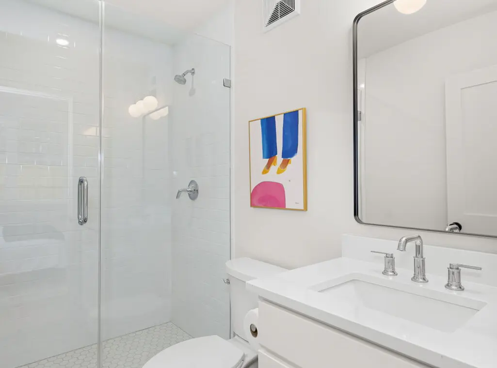 – Primary Bedroom (Bedroom 1): King bed with premium linens, walk-in closet, and private en-suite bathroom featuring walk-in shower with striking blue hexagon floor tile