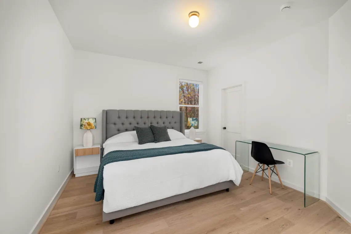 – Bedroom 2: Queen bed, workspace with glass desk and chair (great for remote work!), standard closet, and private en-suite bathroom with shower/tub combo