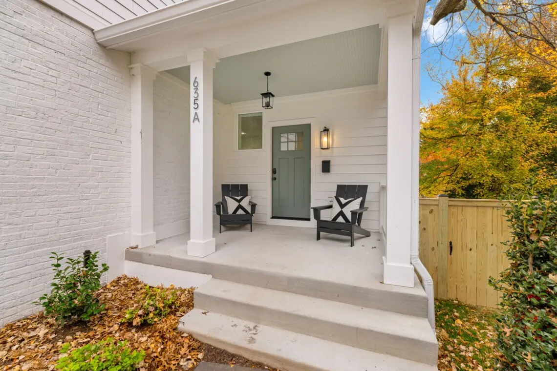 You’ll enter through the charming front porch with Adirondack chairs—a great spot for morning coffee!
